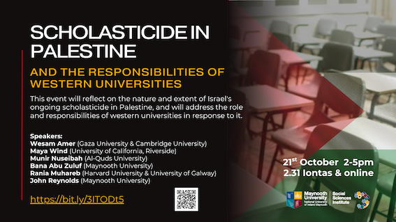 This event will bring together Maynooth researchers and international colleagues to reflect on the concept of ‘scholasticide’ and the nature and extent of the Israeli state’s perpetration of scholasticide against Palestinian scholars, students and sites of learning. The event will also address the role and responsibilities of western universities in response. We invite you to join us to discuss these crucial questions.
