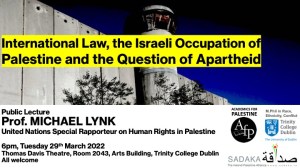 International Law, the Israeli Occupation of Palestine and the Question of Apartheid 6pm, Tuesday 29th March 2022 Thomas Davis Theatre,… Read more: Public Lecture 29/3/22: Michael Lynk, United Nations Special Rapporteur on Palestine