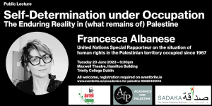 Self-determination under occupation: the enduring reality in (what remains) of Palestine Maxwell Theatre, Hamilton Building, Trinity College Dublin, 6.30pm Eventbrite… Read more: UN special rapporteur Francesca Albanese at TCD June 20th - Public Lecture 29/3/22: Michael Lynk, United Nations Special Rapporteur on Palestine