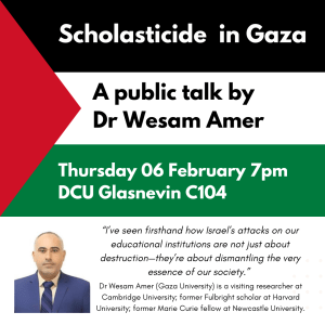 Dr Wesam Amer will deliver a talk on scholasticide on Thursday 06 February at 7pm in C104 (first floor Henry… Read more: Scholasticide talk - Symposium Information Wars: Journalism, Digital Media and the Narrative on Palestine